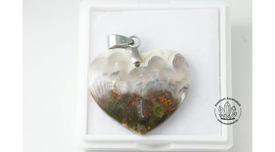 A Kalcedon ásvány család kedves tagja a szürke vagy fehér színű, áttetsző – átlátszó Kalcedon változó zöld és vagy vörös színárnyalatú moha szerű zárványokkal, ami miatt nagyon népszerű. A leginkább zöld vagy néha vöröses zárványok moha, faág vagy erdő képét mintázzák, Klorit, Szeladonit esetleg Hematit miatt látványos. A belőle kitűnő minőségre csiszolt darabokból vékony kabosonokat készítenek, hogy jobban érvényesüljön a zárványok látványa. Ezt a típust az erőteljes fehér és hullámzó mintája miatt Felhő achát – Mohaachát néven ismerik. A bemutatott darabok Indonéziából származnak, egy indonéz csiszoló üzemben készítették kitűnő minőségű csiszolással, mindkét oldalán fényezett darabok! Az anyagban lehetnek apró hibák. A képen látható szív medált saját műhelyünkben készítettük el viselhetővé, mérete kb. 32,5 x 27,5 mm, szemből domború, alul lapos, mindkét felületén fényes. A medált 40 x 40 mm-es ékszerdobozban postázzuk. Színe természetes, megismételhetetlen!