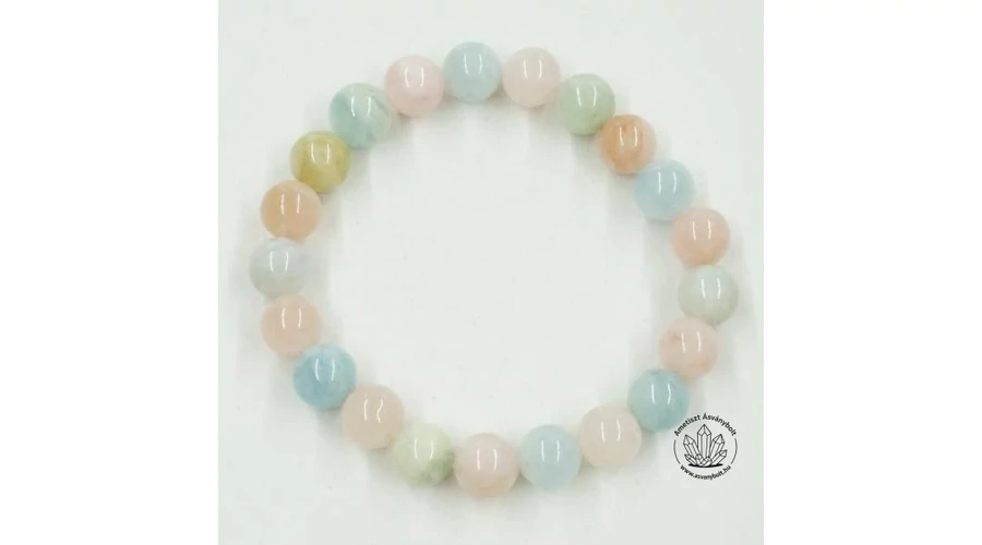 Az ásványékszerek híres anyaga az Akvamarin és annak rózsaszínű változata a Morganit. Ezekből az ásványokból csiszolt 9 mm-es golyókat vegyesen fűztük össze kb 19 cm hosszú karkötőnek.A karkötőben a kék, kékeszöld színek az Akvamarin golyói, a halvány rózsaszín, rózsaszín, sárgás és narancsos színek a Morganit golyói.