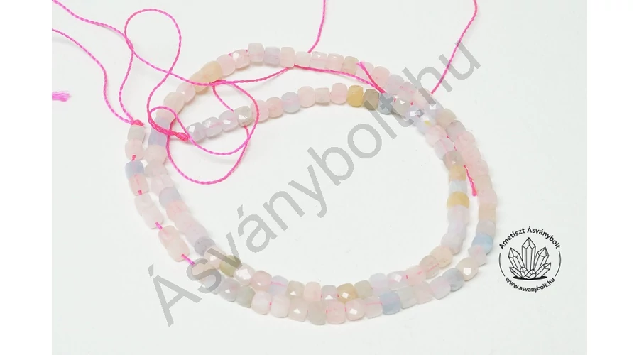 Különleges egyedi csiszolási formával hozták létre az Akvamarin morganit szálat. Az Akvamarin kék színű, a rózsaszín, sárgás, lilás színek Morganitok. A kb. 4 mm-es kocka formákat minden oldalukon még több lappal fazettálták. A kicsi kockák így még csillogóbbak. A kockákat zsinórra fűzték, a zsinóron kb. 39 cm anyag van. A zsinór végeit csomók zárják le.