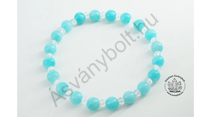 Az Amazonit jó minőségű zöld 6 mm-es golyóit váltogatva fűztük Hegyikristály fazettált 3 x 4 mm-es tárcsáival. Az anyagokat gumi damilra fűztük, a karkötő mérete kb. 17 cm méretű csuklóra alkalmas.