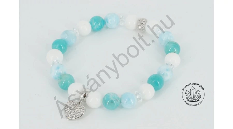 Az Amazonit zöld színe jól kombinálható a Hemimorfit halvány kékjével és a Tejkvarc sápadt fehér színével. A jól válogatott 8 mm-es golyókat Hegyikristály ragyogó fazettált 6 mm-es tárcsáival kombináltuk, amiket 6 mm-es fehér strasszos gyűrűvel és strasszos szív függővel díszítettünk. Egyedi színek, egyedi ragyogás, elegáns viselet ! A karkötő anyagait duplasoros gumira fűztük, a karkötő csukló mérete kb. 16,5 cm.