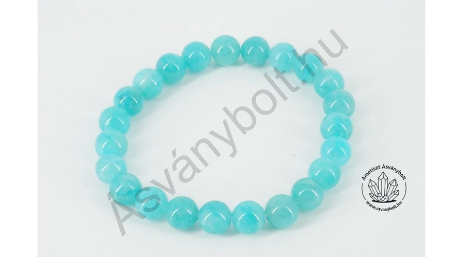 A ritkább Amazonit ásványékszer anyag kékeszöld színű kedvelt változatából fűztünk dupla soros gumira karkötőt. A karkötő mérete a kb. 17 cm-es csuklókra jó méret. Az anyagra a kékeszöld egységes szín és a kevés szürke és fekete zárvány miatt lehet az A minőségi kategóriát használni. A golyókon a földpátokra ( Holdkő, Napkő ) jellemző ezüstös fényjátékot is meg lehet figyelni. A karkötőbe fűzött golyók mérete 8 - 8,5 mm.