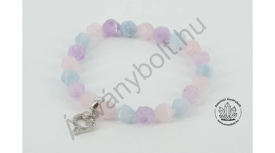 Az Ametiszt akvamarin és rózsakvarc halvány pasztell színeiből látványos ékszer készíthető. A szemeket trapéz és háromszög lapokkal fazettálták, a szemek mérete kb. 8 mm, a karkötő kb. 17,5 cm-es csukóra jó. A köveket duplasoros gumira fűztük. Díszítésnek 6 mm-es gyűrűn függő strasszos lyukas szív formát választottunk.