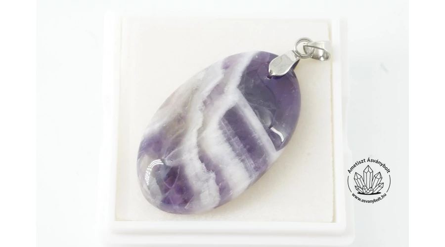 Az Ametiszt népszerű féldrágakő, szinte minden féle ékszert csiszolnak belőle, a tisztább és csak lila nyersanyaga drágább. Az Ametiszt chevron fúrt medál anyaga áttetsző a lila részeken, a chevron ametisztre jellemző fehér sávozás tökéletesen látszik rajta. Saját kézi csiszolású és fúrású megismételhetetlen darab. Az ovális medál magassága alkatrésszel együtt kb. 43 mm magas, felül enyhén domború felületű, alulról lapos. Az alkatrész nemesacélból van. A medált 40 x 40 mm-es dobozkában küldjük.