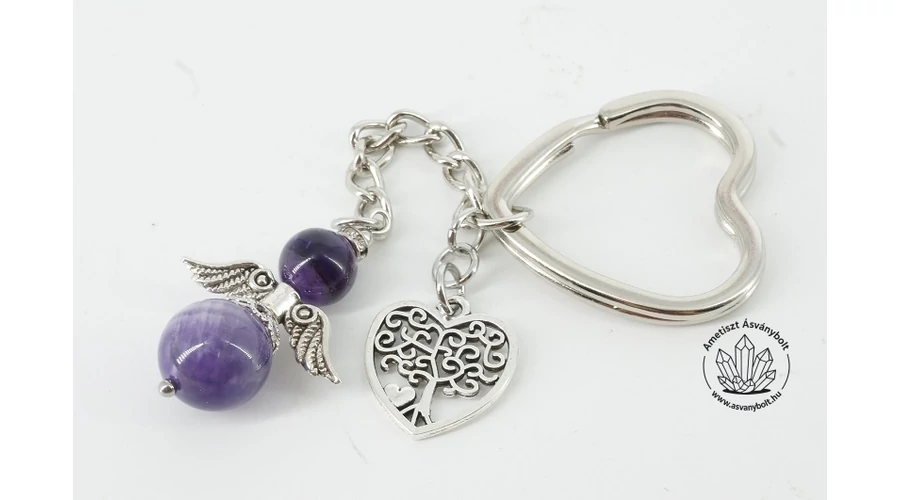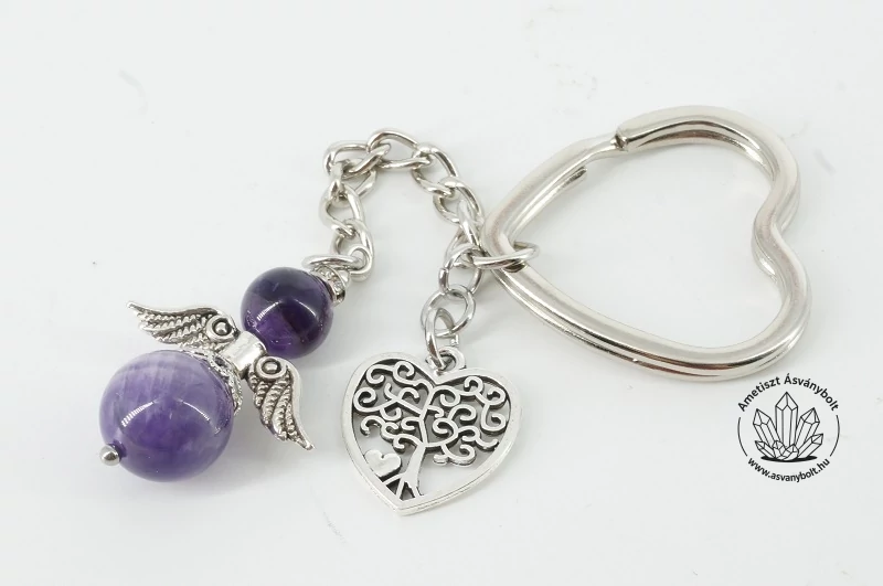 Az Ametiszt 12 mm-es és 8 mm-es golyóiból készítettünk angyalkát díszítő szerelékekkel, ezeket egy szív formájú kulcstartóra szerkesztettük egy életfa mintás szív medállal. A szív formájú kulcstartó mérete kb. 29 mm magas. A szerelékek réz ródium bevonatos fémek és a szív formájú kulcstartó vas alkatrész. A terméket kulcstartónak, táskadísznek is lehet használni.