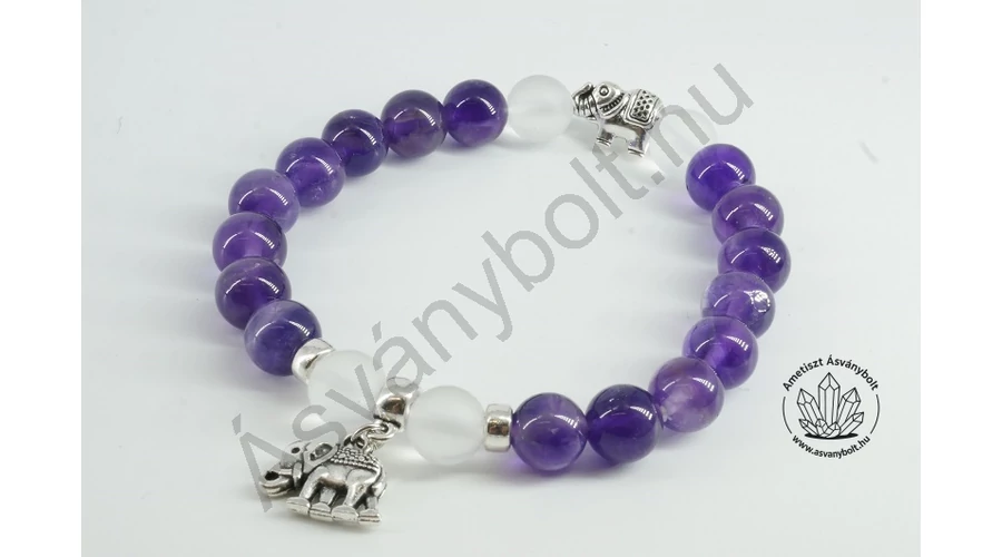 Az Ametiszt népszerű ékszeranyag, jó minőségű és jól válogatott anyagát összefűztük a Hegyikristály matt anyagával. A golyók mérete kb. 8 mm, a karkötő mérete kb. 17 cm-es csuklóra jó. A karkötő fém díszei cink öntvény anyagok, az elefántok szerencse hozó jelképek.
