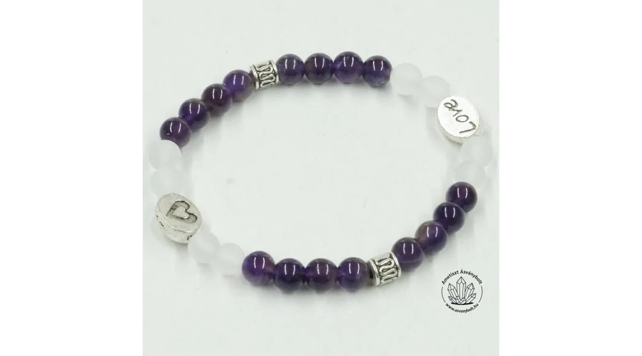 A legnépszerűbb ásványékszerekből készítettünk dekoratív karkötőket. Az Ametiszt lila színe és a Hegyikristály matt változata jól illik színben egymáshoz, ezeket az ásványokat egészítettük ki antiallergén bevonatú fém kellékekkel és duplasoros gumira fűztük. A karkötő hossza kb 20 cm.