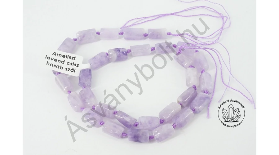 Új divat az ásványok kicsit természetes formáinak a viselése. Az Ametiszt levendula kicsit csiszolt hasáb szerű darabjainak felülete nagyon jól csiszolt és fényesített darabok. Átlátszatlan halvány lila – lilás fehér hasábok, méretük kb. 6-9 mm vastag és 10-12 mm magas darabok, amiket csomózva fűztek egymás után kb. 43 cm hosszban zsinórra. Zsinór nélkül is nagyon jó saját színük van a daraboknak. A zsinóron kb. 28 – 30 db van. A zsinór végeit csomók zárják le.