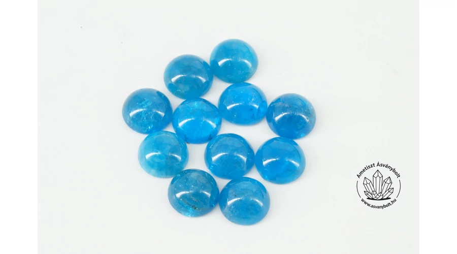 Az Apatit extra kék színű változatából alaposan válogatott kb. 8 mm-es kabosonokat csiszoltak. A kabosonok jó minőségben csiszoltak, átlátszóak – áttetszőek. Mivel különleges anyagból dolgoztak, ezért a fúrt golyókat felezték és csiszolták kabosonnak, ezért a talpon néha láthatók a furat nyomai. Némelyik kaboson felületén különleges fényjelenséget, az Apatit-macskaszem fényhatást figyelhetjük meg.
