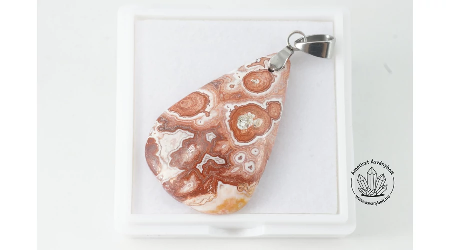 Az Aragonit egy érdekes ásvány, általában tömeges megjelenése réteges és színes, ilyenkor nagy tömbökben bányászható. Egyik ilyen már ismert aragonit a kereskedelemben Ónixmárvány néven forgalmazott díszítőkő, amiből dísztárgyakat, asztal és pult burkolatokat készítettek. A színes rétegeket több féle ásvány színezi, színanyag nélkül fehér vagy szürke, mint a korondi aragonit, ha a színező anyaga vas ásvány, akkor narancsos-vöröses rétegekből áll és a csiszoláskor kiemelhető a mintázat. Ilyen anyag a Beninből származó színes aragonit, amiből könnyű mutatós medálokat csiszolni. A bemutatott darab indiai csiszoló üzemben készült, de itthon mindig javítok a csiszolási minőségen. A fúrást és nemesacél alkatrészezést saját műhelyünkben készítettük. A medál mérete alkatrésszel együtt kb. 42 mm, a medált 4 x 4 cm-es műanyag ékszer dobozkában küldjük.