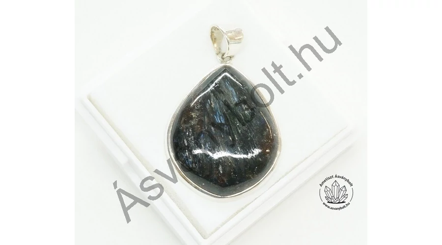 Az Asztrofillit ritka ásvány, extra minőségét egyedileg csiszolják és ezüstbe foglalják. A nyersanyag lelőhelye Kola félsziget, Oroszország. A medál anyaga átlátszatlan és világoskék – bronzbarna  szálak adják a különleges fényjátékát és láthatók benne apró Pirit ásványok, amik természetesek és nem rontják az ékszer minőségét. A csiszolt medál alul lapos, felül domború kaboson csiszolású, a szegélyénél van körbe foglalva ezüst foglalattal. A foglalat alulról nyitott, így jól látszik a kő minősége. A medál mérete jól viszonyítható az 50 x 50 mm-es dobozka méretéhez, a kő mérete kb. 31 x 25 mm és kb. 8 mm magas, a medál teljes magassága kb. 45 mm.