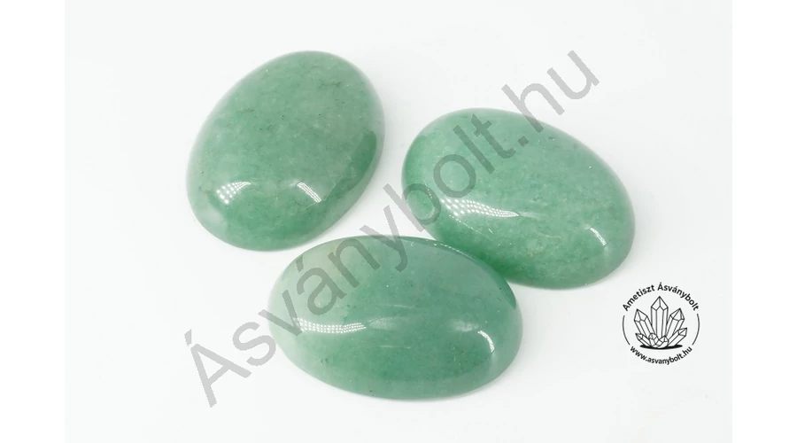 Az Aventurin világoszöld – középzöld, áttetsző - átlátszatlan változatából csiszolt kaboson mérete 13 x 18 mm, az alapján lapos, felülről enyhén domború, mindkét felületén fényes. Alkalmas foglalható, ragasztható és körbefonható ékszerek készítéséhez. Színe természetes, a képen látott darabokhoz hasonlóakat tudunk küldeni.