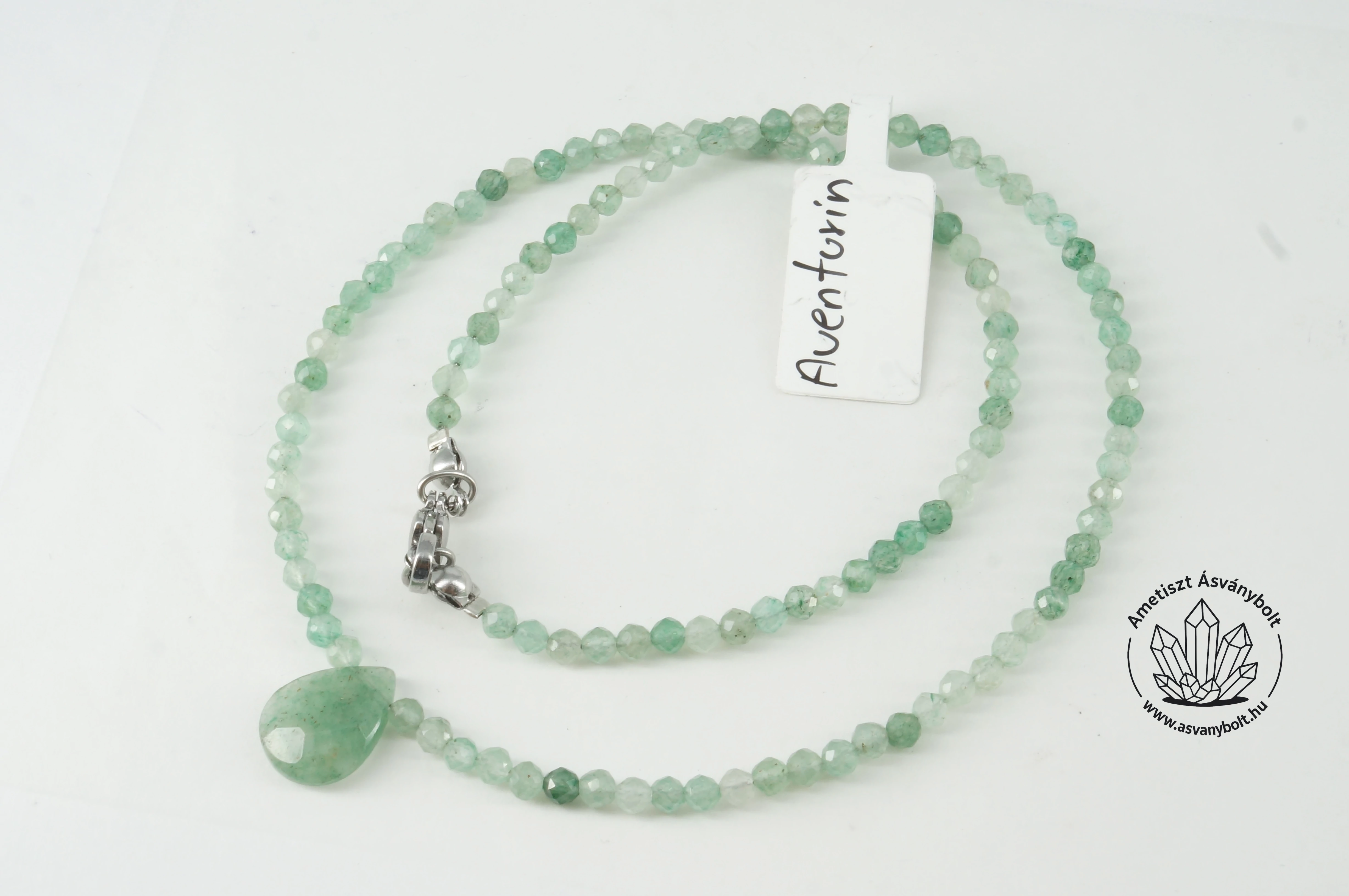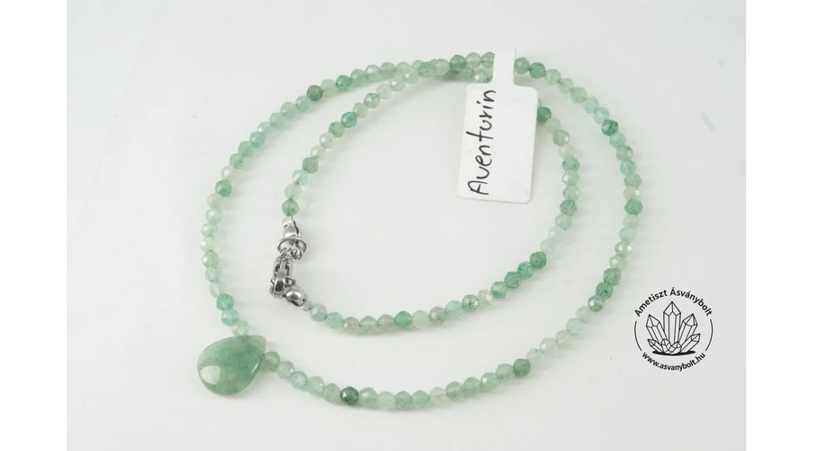Az Aventurin halvány zöld anyaga nagyon népszerű ásvány, a fazettált golyók mérete 3,5 - 4 mm. Az acélsodronyra fűzött anyagot nemesacél alkatrészekkel végezzük, így a lánc teljes hossza kb. 43 cm. A lánc közepére egy fazettált 14 x 10 mm-es csepp formát fűztünk.