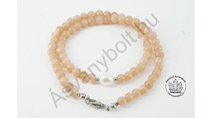 A Holdkő világosbarna változatából csiszolt 6 mm-es golyókkal és egy édesvizi tenyésztett gyöngy méretes, kb. 10 mm-es gyöngyszemével láncot alkottunk néhány nemesacél golyóval és nemesacél szerelékkel. Az anyagokat acél sodronyra fűztük, a lánc teljes hossza kb. 44,5 cm.