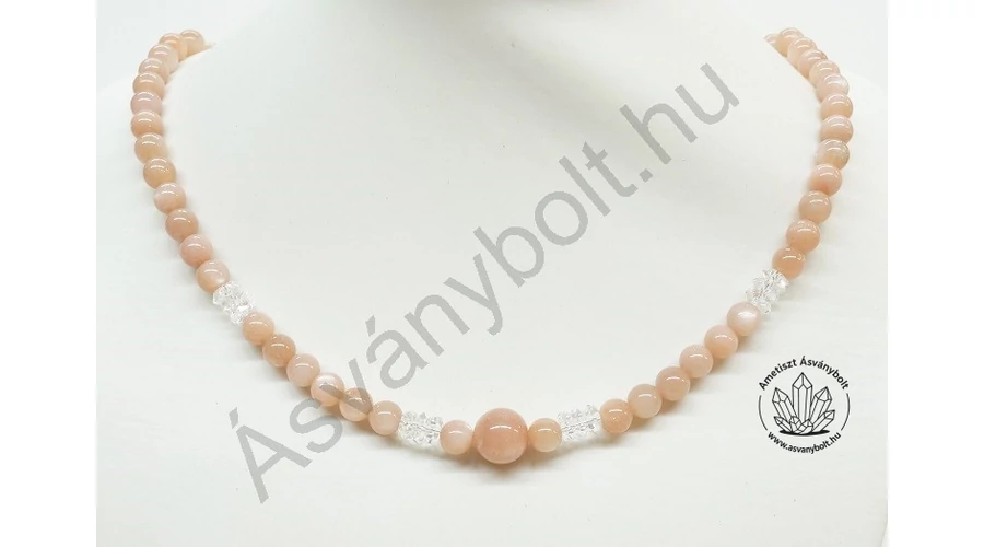 A Barna holdkő legjobb minőségű egységes barnás 6 mm-es golyóiból, egy darab 10 mm-es Barna holdkő golyóval és néhány Hegyikristály fazettált tárcsával alkottunk láncot. Az anyagokat acélsodronyra fűztük, a lánc végeit mágnes kapocs zárja le, a lánc teljes hossza kb. 43 cm.