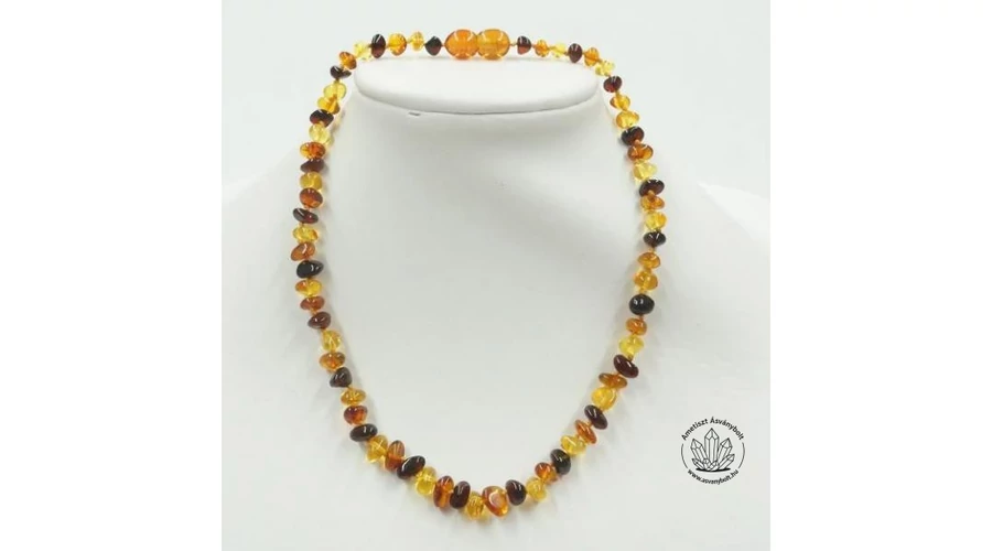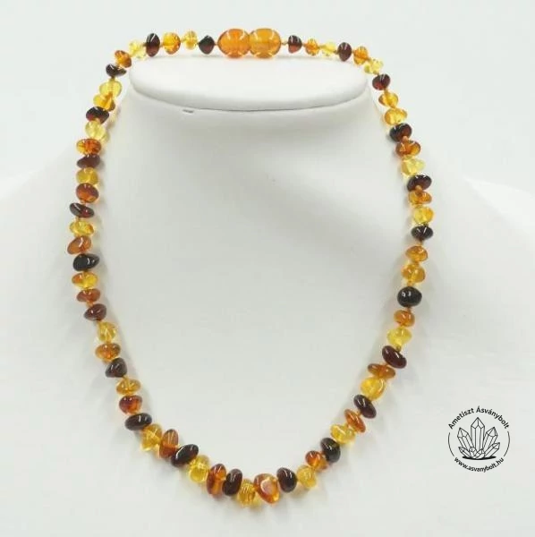 Babáknak készített, szemenként csomózott háromszínű (konyak-sötétbarna-világossárga ) gömbölyített borostyán lánc, melynek végén menetes vagy bepattintós műanyag zár van. A szemek mérete a nyaklánc közepe felé növekszik. A fogzási fájdalmak enyhítésében segít. Teljes hossza zárral együtt kb. 33 cm.