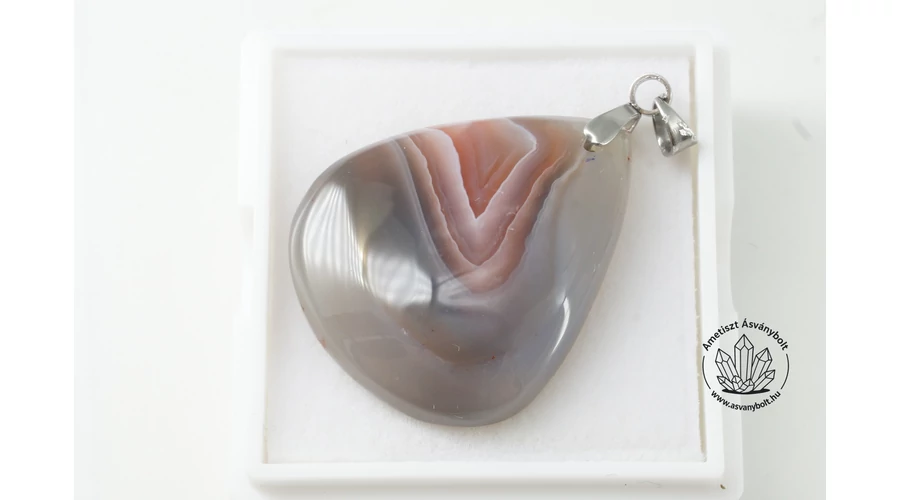 Az achátok között híres lelőhely a namíbiai Botswana achát anyaga. Leginkább sűrű és finom sávozásáról és egyedi színeiről ismert ékszerkő. Innen általában a szürke színek az általánosak, majd a vöröses-narancsos színek és a legdrágábbak a rózsaszínű színárnyalatok. A vöröses színű és nagy achát gumók anyagából csiszolták az indiai csiszoló műhelyekben ezeket a kabosonokat, amiknek a felülete jól csiszolt, alul is fényezett darabok. Valódi színek, nincs festve egyik sem. Saját műhelyünkben a fúrást és a nemesacél alkatrésszel a medál készítést végeztük. A medál mérete alkatrésszel együtt kb. 40 x 26 mm, a medált 4 x 4 cm-es ékszerdobozban küldjük.