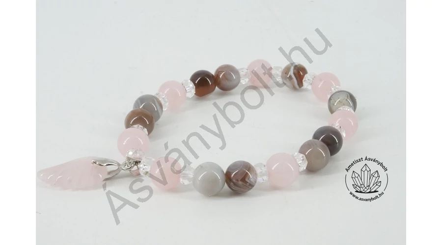 A látványos mintázatú Botswana achát 8 mm-es golyóit a népszerű Rózsakvarc 8 mm-es golyóival és a csillogó szintetikus Hegyikristály fazettált 3x5 mm-es tárcsáival összefűztük dupla soros gumira karkötőnek. A karkötőről egy Rózsakvarc angyalszárny is függ. A karkötő mérete kb 19 cm.