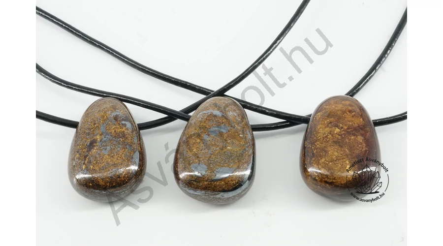 A Bronzit természetes anyagából csiszolt és fúrt medálok látványos darabok csillogásuk miatt. A medálok szabálytalan csiszolásúak, kisebb csiszolási vagy anyaghibák láthatók rajtuk. A medálok kb. 2,5 – 3 cm közötti darabok, vastagságuk 8 – 12 mm közötti, a furaton keresztül fekete hengerbőrt fűztünk aminek a hossza kb. 50 cm.