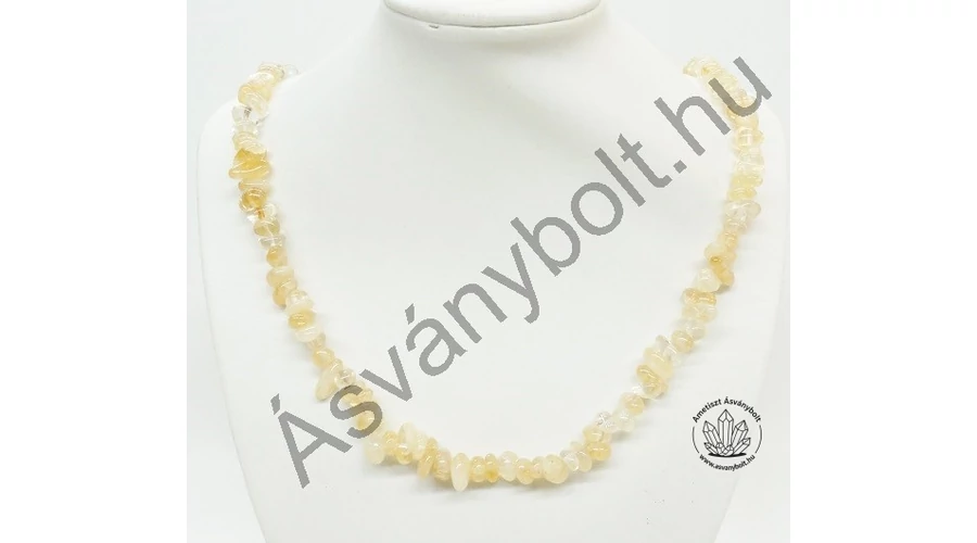 A Citrin féldrágakő minden szemcséjét gömbölyűre csiszolják, hogy kényelmesebb legyen a viselése. Ez az anyag halvány színű és inkább áttetsző. A szemek mérete 0,5 - 1,5 cm közötti, sodronyra vannak fűzve, a lánc végén nemesacél alkatrészek zárják. A lánc hossza kapoccsal együtt kb. 53 cm.