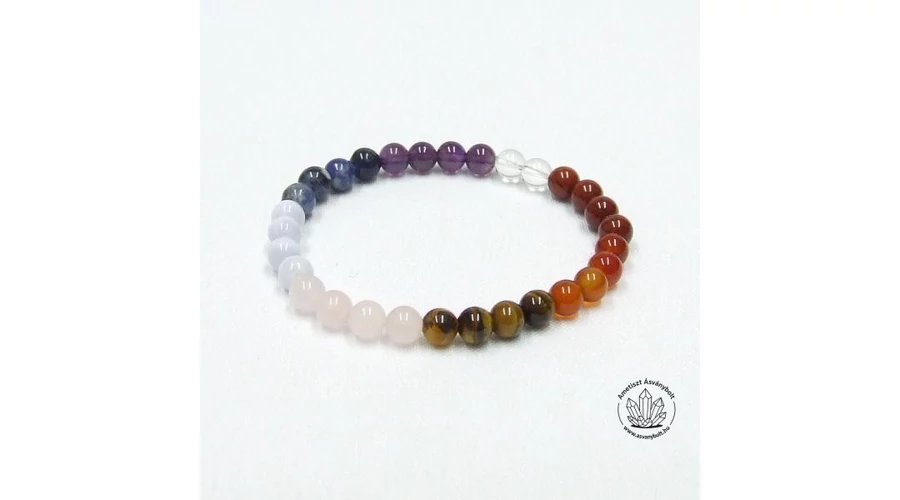 A csakra karkötő 6 mm-es golyókból van összefűzve a csakraközpontok sorrendje szerint alulról fölfelé haladva. A sort hegyikristály golyók választják el egymástól, hogy a hegyikristály erejét is használhassuk. A sorrend tehát a viszonylag egyszerűen beszerezhető és még elfogadható áru láncban : jáspis, karneol, tigrisszem, rózsakvarc, kalcedon, szodalit és az ametiszt. Így megalkottunk egy kb. 18 cm-es karkötőt, amiben minden csakrakő megtalálható és még szép is.