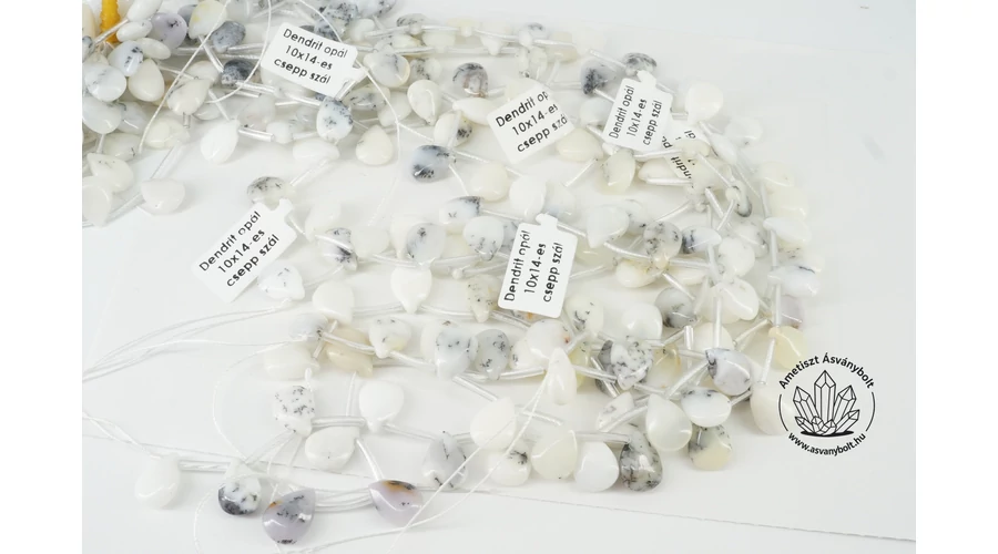 Az érdekes zárványú és emiatt Merlinitnek is nevezett Dendrites Opál ásványékszer anyag kb. 38 cm hosszú, a felfűző zsinór mindkét végét csomó zárja le. A zárványokat okozó Mangán ásvány különféle ágakra, tollakra hasonlító formákat mutat, ettől válik értékessé a túlnyomórész fehér színű Opál, de látunk a szálon zöldes és sárgás színeket is. Az opál Madagaszkárról származik. A szálra fűzött cseppek mérete 10 x 14 mm, vastagságuk 4 – 5 mm, a szálon legalább 24 db csepp van felfűzve. A golyók felülete az anyag puhasága miatt kicsit szabálytalan.