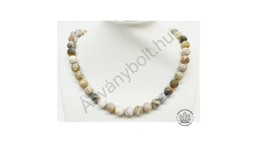 Az érdekes zárványú és emiatt Merlinitnek is nevezett Dendrites Opál ásványékszer anyag 10 mm-es golyóiból fűztünk láncot bőrvarró zsinórra kb. 45 cm hosszban. ami az antiallergén alkatrészekkel együtt értendő. A zárványokat okozó Mangán tartalmú ásvány különféle ágakra, tollakra hasonlító formákat mutat, ettől válik értékessé a túlnyomórész fehér, sárgásbarna színű Opál. A golyók felülete az anyag puhasága miatt kicsit szabálytalan.