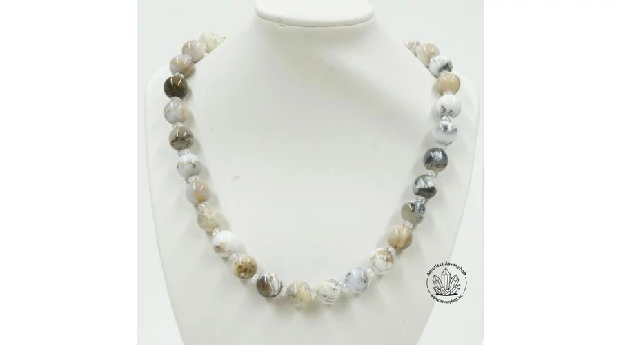 Az Opálok között ritka a rétegei között berakódó mangándendrit más néven dendrites opál ( a dendrit név jelentése : faágak, lombozat szerű rajzolat ). Ezt a fajta megjelenést az ezotéria MERLINIT-nek is nevezi. Az anyagból 12 mm-es golyókat csiszoltak, ezekben nagyon szépen kirajzolódnak a mangándendrit rajzolatok. A golyókat a Hegyikristály fazettált kicsi tárcsái választják el enyhe csillogást adva a láncnak. A láncot a végein mágneskapocs zárja, az alkatrészek antiallergén bevonatos fémek. A lánc hossza kb 49 cm. Készlet : 1 db. Ára . 11500 Ft.