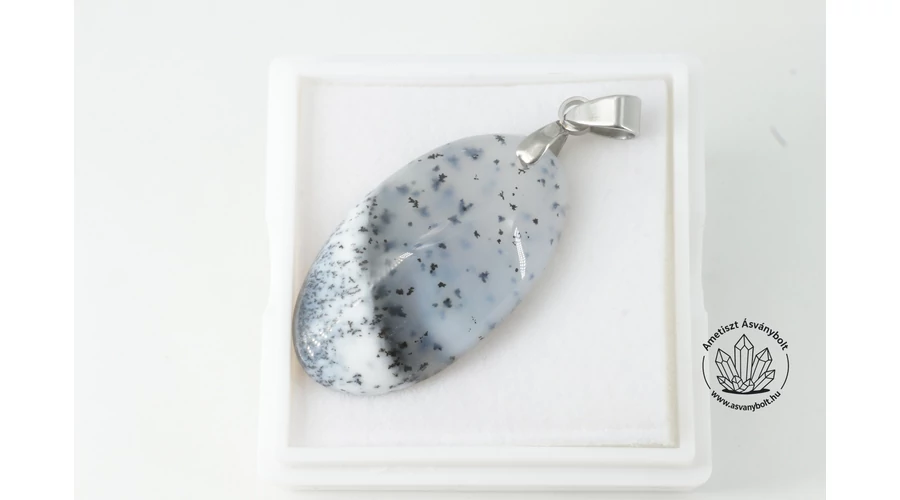 A Merlinit ezoterikus név mögött két fajta ásványt szoktak bemutatni. Ezek a Dendrites Achát és a Dendrites Opál. Az extra minőségű Dendrites Opál fehér – kékesfehér alapszínében változó mennyiségű és rajzolatú fekete Mangán rajzolatokat, dendriteket lehet találni, ezekből csiszolnak különböző kaboson formákat indiai műhelyekben. A csiszolt kaboson alul lapos, felül domború csiszolású, minden oldalán kitűnő minőségű, fényezésű. A kabosont saját műhelyemben fúrtam és nemesacél alkatrésszel készítettem el medálnak. A medál mérete jól viszonyítható az 4 x 4 cm-es dobozka méretéhez, ebben postázzuk. A medál magassága alkatrésszel együtt kb. 43 mm magas, 17,5 mm széles.