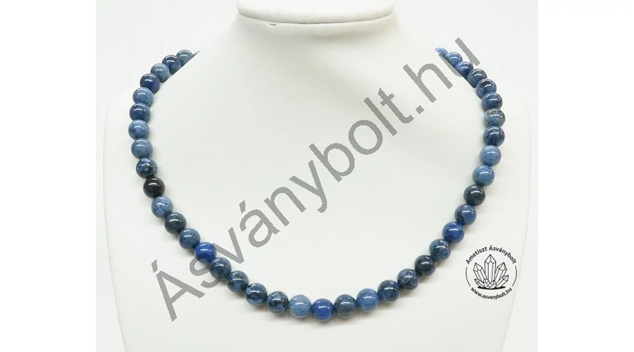 A ritkán beszerezhető és vásárolható Dumortierit ásványékszer anyag 8 mm-es golyóiból fűztünk zsinórra kb. 40 cm hosszú anyagot, felfűző zsinór mindkét végét antiallergén fém alkatrészek zárják le, így a lánc hossza kb. 43 cm.