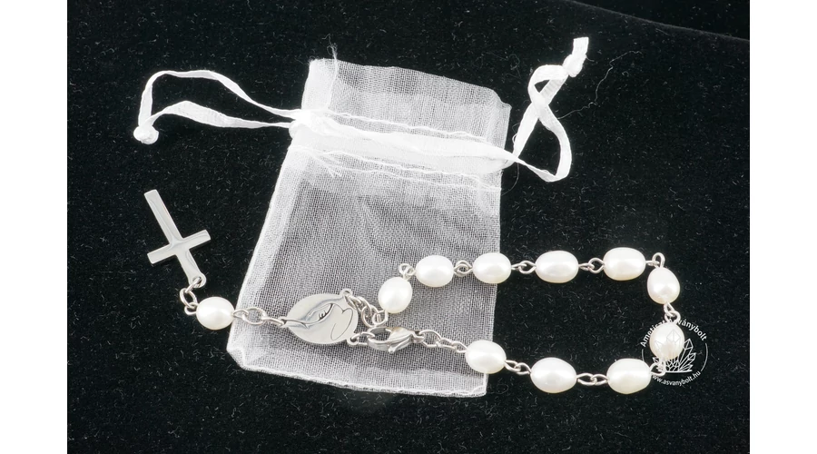 A valódi édesvizi gyöngy tizedes rózsafüzér hófehér és ragyogó felületű 7 - 9 mm-es gyöngyökből és nemesacél alkatrészekből van összeállítva teljes mértékben saját kézi munkával. Teljes hossza kb. 13,5 cm. Fehér színű organza tasakba csomagolva küldjük.