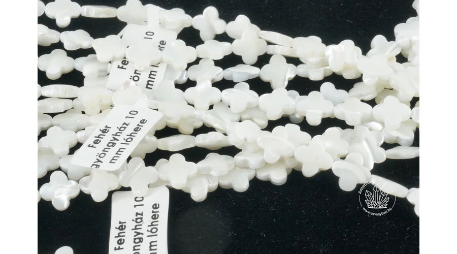 Némelyik vastaghéjú kagylóféléből vagy csigaházból könnyen tudnak különböző formákat is csiszolni, ezek az anyagok rétegesen gyöngyházfényűek. Az anyagot kb. 39,5 cm hosszban damilra fűzték, aminek mindkét végét csomó zárja le. A szálra fűzött lapos lóhere mérete kb. 10 mm, tehát a szálon legalább 39 db lapos lóhere van felfűzve. Csiszolásuk kitűnő minőség! A szálat így alkatrészek nélkül lehet vásárolni, a terméket saját munkával lehet bármilyen ékszernek elkészíteni. Hozzávaló alkatrészek az alkatrészek menüben választhatók.