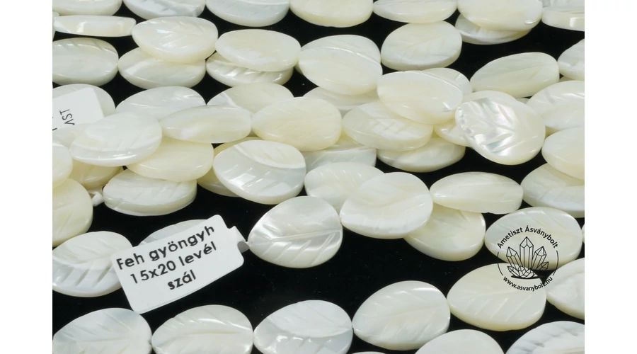 Némelyik vastaghéjú kagylóféléből vagy csigaházból könnyen tudnak különböző formákat is csiszolni, ezek az anyagok rétegesen gyöngyházfényűek. Az anyagot kb. 39 cm hosszban damilra fűzték, aminek mindkét végét csomó zárja le. A szálra fűzött lapos faragott levél mérete kb. 15 x 20 mm, tehát a szálon legalább 18 db lapos faragott levél van felfűzve. Csiszolásuk kitűnő minőség! A szálat így alkatrészek nélkül lehet vásárolni, a terméket saját munkával lehet bármilyen ékszernek elkészíteni. Hozzávaló alkatrészek az alkatrészek menüben választhatók.