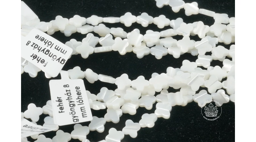 Némelyik vastaghéjú kagylóféléből vagy csigaházból könnyen tudnak különböző formákat is csiszolni, ezek az anyagok rétegesen gyöngyházfényűek. Az anyagot kb. 39 cm hosszban damilra fűzték, aminek mindkét végét csomó zárja le. A szálra fűzött lapos lóhere mérete kb. 8 mm, tehát a szálon legalább 46 db lapos lóhere van felfűzve. Csiszolásuk kitűnő minőség! A szálat így alkatrészek nélkül lehet vásárolni, a terméket saját munkával lehet bármilyen ékszernek elkészíteni. Hozzávaló alkatrészek az alkatrészek menüben választhatók.