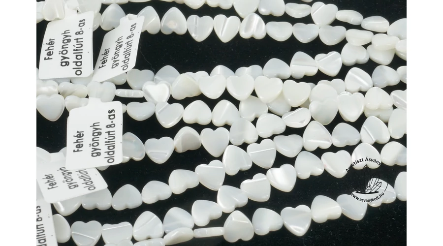 Némelyik vastaghéjú kagylóféléből vagy csigaházból könnyen tudnak különböző formákat is csiszolni, ezek az anyagok rétegesen gyöngyházfényűek. Az anyagot kb. 39 cm hosszban damilra fűzték, aminek mindkét végét csomó zárja le. A szálra fűzött lapos szív mérete kb. 8 mm, tehát a szálon legalább 46 db lapos szív van felfűzve. Csiszolásuk kitűnő minőség! A szálat így alkatrészek nélkül lehet vásárolni, a terméket saját munkával lehet bármilyen ékszernek elkészíteni. Hozzávaló alkatrészek az alkatrészek menüben választhatók.