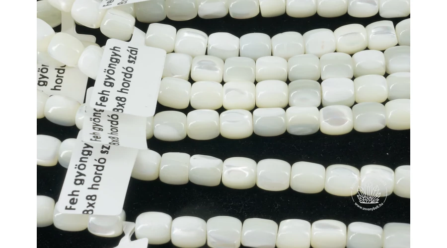 Némelyik vastaghéjú kagylóféléből vagy csigaházból könnyen tudnak különböző formákat is csiszolni, ezek az anyagok rétegesen gyöngyházfényűek. Az anyagot kb. 39,5 cm hosszban damilra fűzték, aminek mindkét végét csomó zárja le. A szálra fűzött hordók mérete kb. 8 x 6 mm, tehát a szálon legalább 46 - 49 db hordó van felfűzve. Csiszolásuk kitűnő minőség! A szálat így alkatrészek nélkül lehet vásárolni, a terméket saját munkával lehet bármilyen ékszernek elkészíteni. Hozzávaló alkatrészek az alkatrészek menüben választhatók.