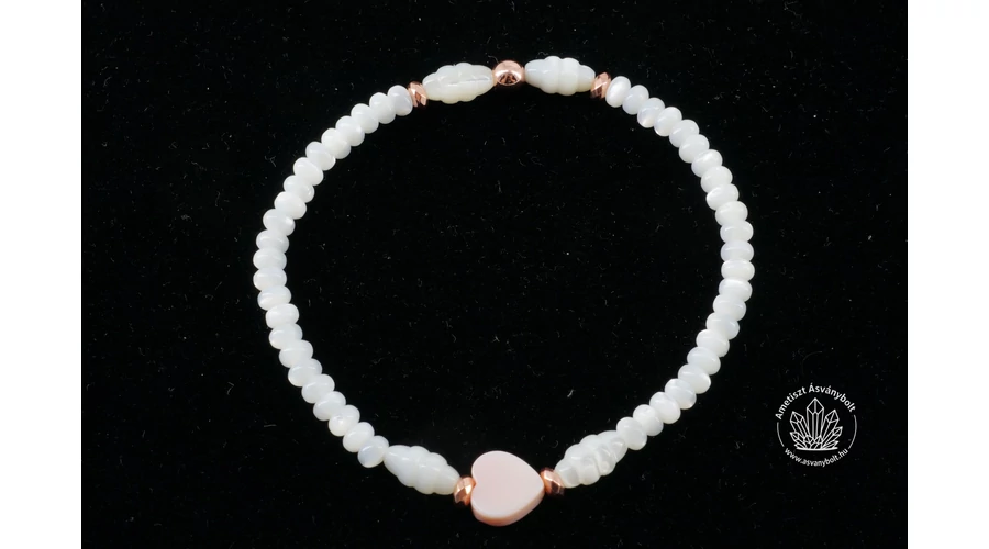 Némelyik vastaghéjú kagylóféléből vagy csigaházból könnyen tudnak különböző formákat is csiszolni, ezek az anyagok rétegesen gyöngyházfényűek. A karkötőbe fűzött korongok mérete kb. 3 x 4 mm, csiszolásuk kitűnő minőség! A korongokat fazettált rózsaarany hematittal, faragott rizsszem gyöngyházzal díszítettük és különleges alkotója a rózsaszínű kagylóhéjból mindkét oldalán lapos 8 mm-es fűzhető szív. Az anyagokat gumi damilra fűztük egy kb. 16 cm csuklónak megfelelő méretben.
