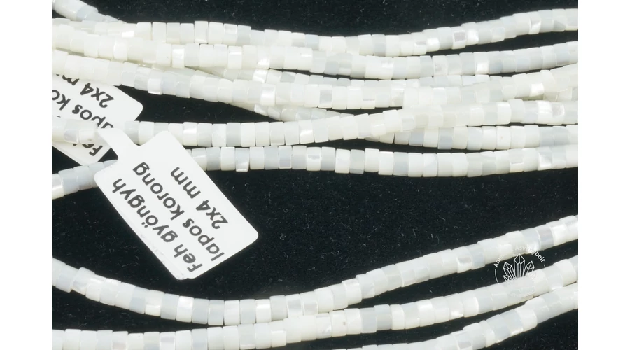 Némelyik vastaghéjú kagylóféléből vagy csigaházból könnyen tudnak különböző formákat is csiszolni, ezek az anyagok rétegesen gyöngyházfényűek. Az anyagot kb. cm hosszban damilra fűzték, aminek mindkét végét csomó zárja le. A szálra fűzött lapos korongok mérete kb. 2 x 4 mm, tehát a szálon legalább 160 db lapos korong van felfűzve. Csiszolásuk kitűnő minőség! A szálat így alkatrészek nélkül lehet vásárolni, a terméket saját munkával lehet bármilyen ékszernek elkészíteni. Hozzávaló alkatrészek az alkatrészek menüben választhatók.