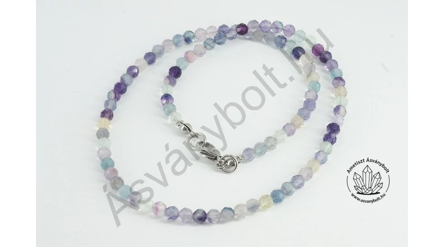 A Fluorit színes és látványos ásvány, sokszor vegyes színekben fűzik össze. A fazettált 4 – 4,5 mm-es golyókat acélsodronyra fűztük kb. 41 cm hosszban nemesacél alkatrészekkel együtt.