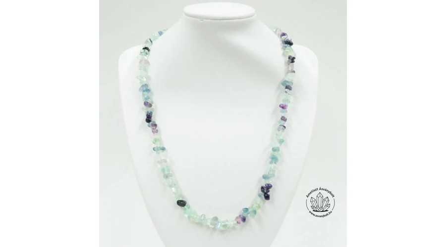 A Fluorit féldrágakő minden szemcséjét gömbölyűre csiszolják, hogy kényelmesebb legyen a viselése. A szemek mérete 0,5 - 1 cm közötti, sodronyra vannak fűzve, a lánc végén nemesacél fémalkatrészek zárják. A lánc hossza kapoccsal együtt kb 52 cm.