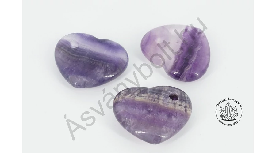 A Fluorit különleges színes ásvány, szeretik mindenféle terméknek megmunkálni. A szív medálok általában lila színűek, különbség az átlátszatlanság – átlátszóság között van. Oldalról és szemből vannak fúrva, hogy egyszerű bőrszálon is viselhető legyen. A képen láthatókhoz hasonló darabokat tudunk küldeni. A szívek méretei : kb. 30 mm széles, 25,5 mm magas és 8 mm vastag.
