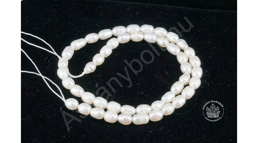 Az édesvízi gyöngy 5-6 mm fehér rizsszem szál anyaga hosszúkás tojásdad formájú gyöngyszemek, nagyon szabálytalan gyöngyök, a furata az átlagoshoz képest nagyobb, 1 mm, gumis karkötőkhöz kiváló furatú. A szál hossza kb. 34,5 cm, a gyöngyök színe sárgás fehér, változó fényességű.