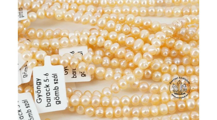 Az édesvízi gyöngy 5-6 mm természetes barackos gömbölyített szál anyaga egységes kerekded formájú gyöngyszemek, a felületük enyhén “nadrágszíjas “. A szemek fényes barackos – narancsos, néhány sápadt színű. A szál hossza kb. 35 cm, a szálon fűzött gyöngyök furata kb. 1 mm, gumira könnyen fűzhetők. A gyöngyöket zsinórra fűzték, a zsinór végeit csomók zárják le.