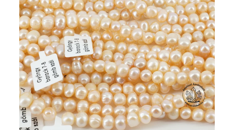 Az édesvízi gyöngy 7-8 mm természetes barackos gömbölyített szál anyaga egységes kerekded formájú gyöngyszemek, a felületük enyhén “nadrágszíjas “. A szemek fényes barackos – narancsos, néhány sápadt színű. A szál hossza kb. 35 cm, a szálon fűzött gyöngyök furata kb. 1 mm, gumira könnyen fűzhetők. A gyöngyöket zsinórra fűzték, a zsinór végeit csomók zárják le.