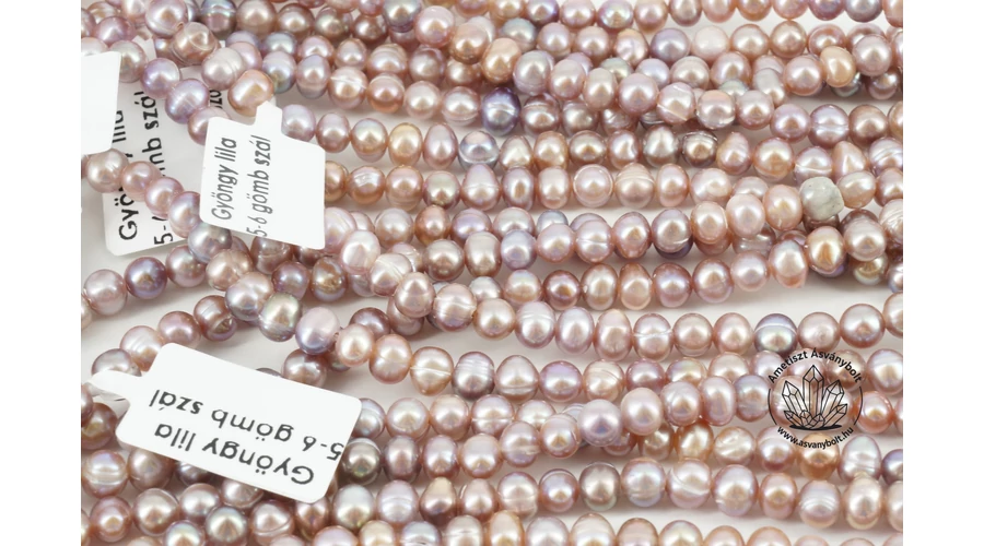 Az édesvízi gyöngy 5-6 mm természetes barnás lila gömbölyített szál anyaga egységes kerekded formájú gyöngyszemek, a felületük enyhén “nadrágszíjas “. A szemek fényes barnás – lilás, néhány sápadt színű. A szál hossza kb. 35 cm, a szálon fűzött gyöngyök furata kb. 1 mm, gumira könnyen fűzhetők. A gyöngyöket zsinórra fűzték, a zsinór végeit csomók zárják le.