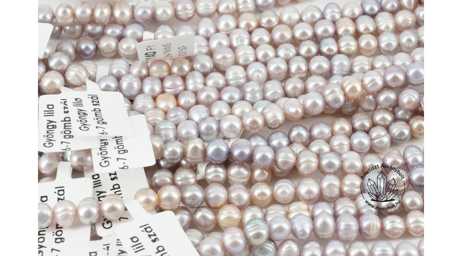 Az édesvízi gyöngy 6-7 mm természetes barnás lila gömbölyített szál anyaga egységes kerekded formájú gyöngyszemek, a felületük enyhén “nadrágszíjas “. A szemek fényes barnás – lilás, néhány sápadt színű. A szál hossza kb. 35 cm, a szálon fűzött gyöngyök furata kb. 1 mm, gumira könnyen fűzhetők. A gyöngyöket zsinórra fűzték, a zsinór végeit csomók zárják le.