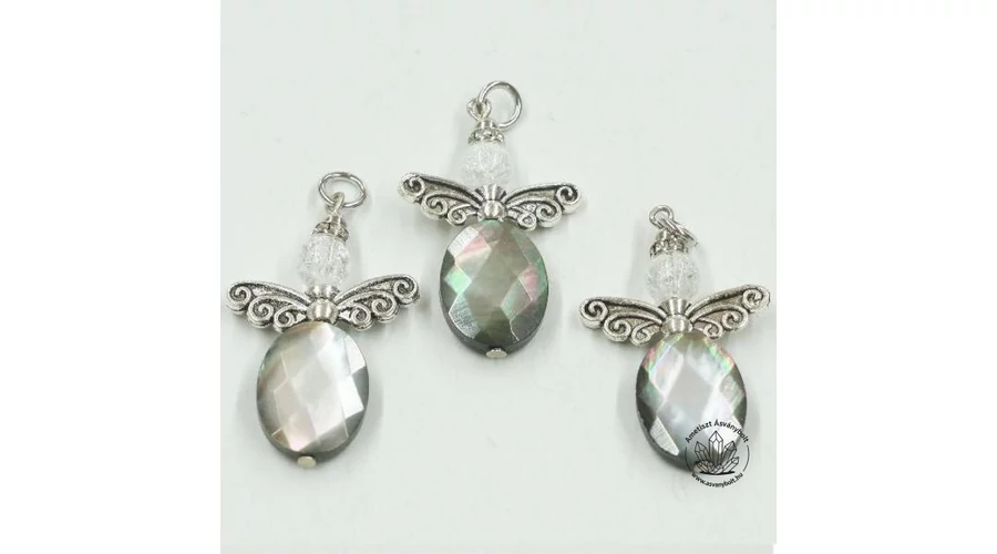 A Gyöngyház – természetes kagylóhéj szivárványos szürke anyagából csiszolt fazettált ovál formából elegáns tündér medált lehetett készíteni. A színes anyag csillogását a Repesztett Hegyikristály csillogó 6 mm-es golyójával emeltük és csillogó strasszgyűrűt is építettünk az ékszerbe. A fémalkatrészek antiallergén anyagok, a medál magassága kb 4 cm.