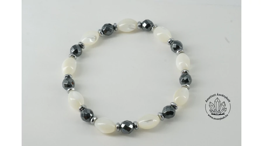 Némelyik vastaghéjú kagylóféléből vagy csigaházból könnyen tudnak különböző formákat is csiszolni, ezek az anyagok rétegesen gyöngyházfényűek. A nagy rizsszemek mérete kb. 6 x 10 mm, csiszolásuk kitűnő minőség! A rizsszemek közé ezüst színű fazettált hematit korongokat és fekete színű 6 mm-es fazettált golyókat fűztünk, az anyagokat gumi damilra fűztük egy kb. 16 cm méretű csuklónak megfelelő méretben.