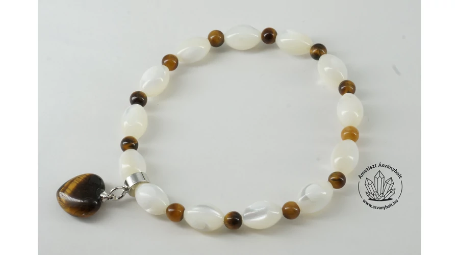Gyöngyház rizsszem karkötő tigrisszem szívvel