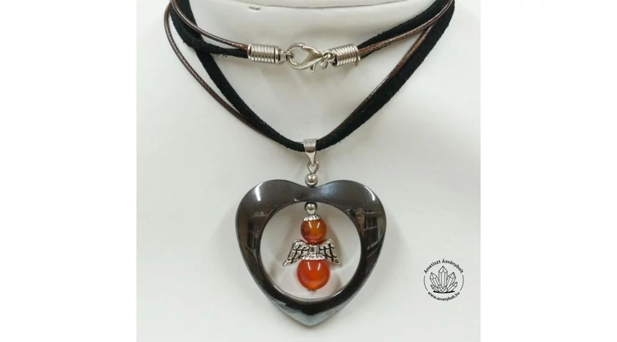 Az ékszer Hematit része egy 34 mm magas szív, ennek a felső részét átfúrták. Ebbe a furatba készítettünk Karneol 6 és 8 mm-es golyóiból és antiallergén alkatrészekből álló angyalkát. A medált textilzsinórokból összeállított láncra fűztük, aminek a hossza alkatrészekkel együtt kb 43 cm.